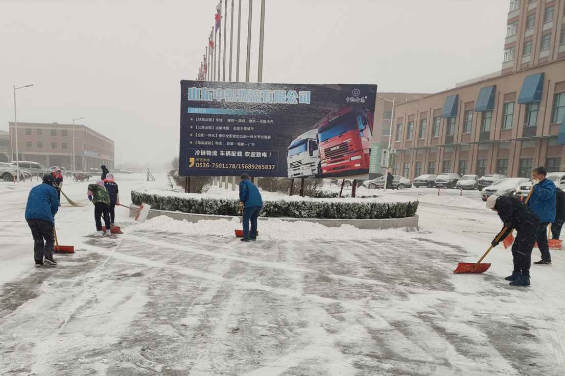 由于降雪較大,地面的積雪厚厚一層,只能鏟雪板先行,再用掃帚和鐵鍬跟進(jìn),經(jīng)過數(shù)小時的奮戰(zhàn),終于將園區(qū)的西門、北門、主干道、地下停車場入口、商務(wù)樓、一號冷鏈南門等路段的積雪清除完畢,最大